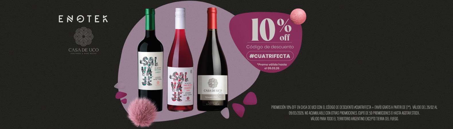 10% DE DESCUENTO EN CASA DE UCOPromo: 10% DE DESCUENTO EN CASA DE UCO CON EL CÓDIGO #CUATRIFECTA. PROMOCIÓN VÁLIDA DESDE EL 26/02 HASTA EL 09/03/2026 Ver mas |